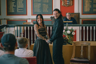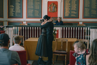 Nestled among Rye’s cobbled streets, the Town Hall exudes history and charm. Its grand wooden interiors, tall windows, and soft, atmospheric light provide a naturally cinematic backdrop for couples who appreciate drama, elegance, and timeless style. Every corner offers textures and shadows that lend themselves beautifully to moody, editorial imagery. Hannah and Daniel’s ceremony was a study in quiet, heartfelt emotion. Candlelight flickered softly against historic walls, rain tapped gently against the windows, and a hush of anticipation made the moment feel entirely suspended in time. Hannah entered with serene confidence, while Daniel’s expression radiated love, awe, and pride. Their vows were intimate, deeply personal, and shared with only their closest family and friends—a moment of pure connection.